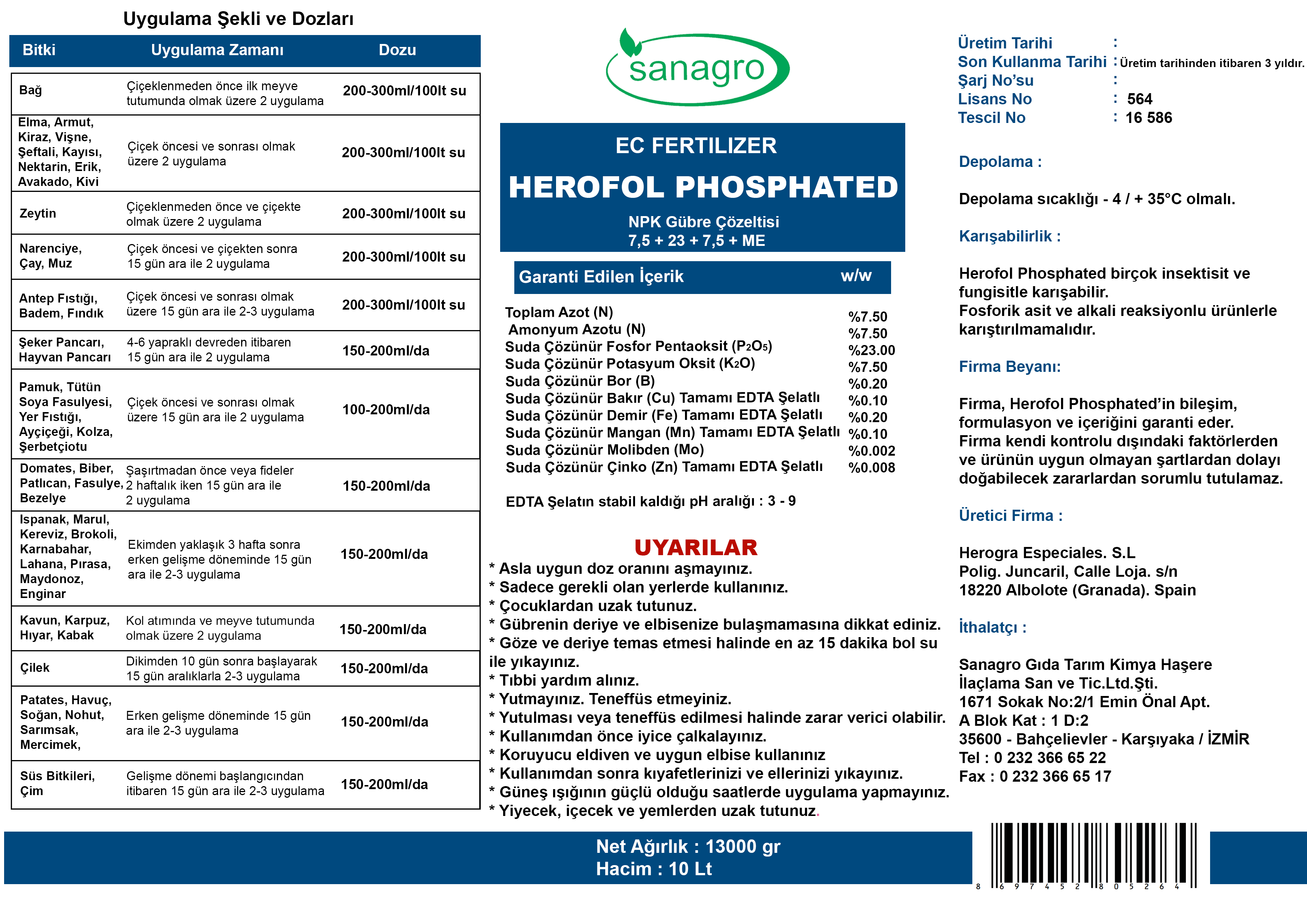 Suda Çözünür Tamamı EDTA ile Şelatlı Demir (Fe) | %0,2 |